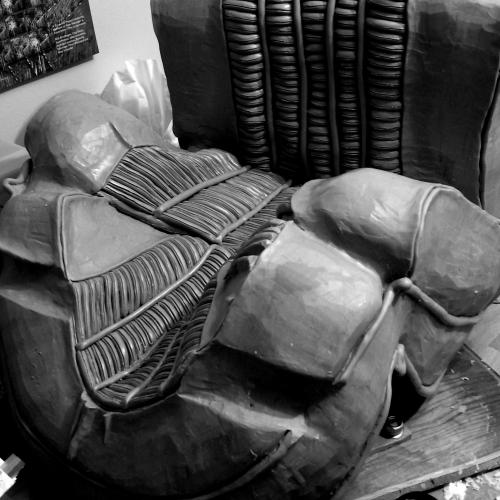 Def Mec: Think about what youβve done (Suppression) (2022): I value the techniques I developed while creating this piece. I also love the tension of it's roundness on the chair facing the corner.